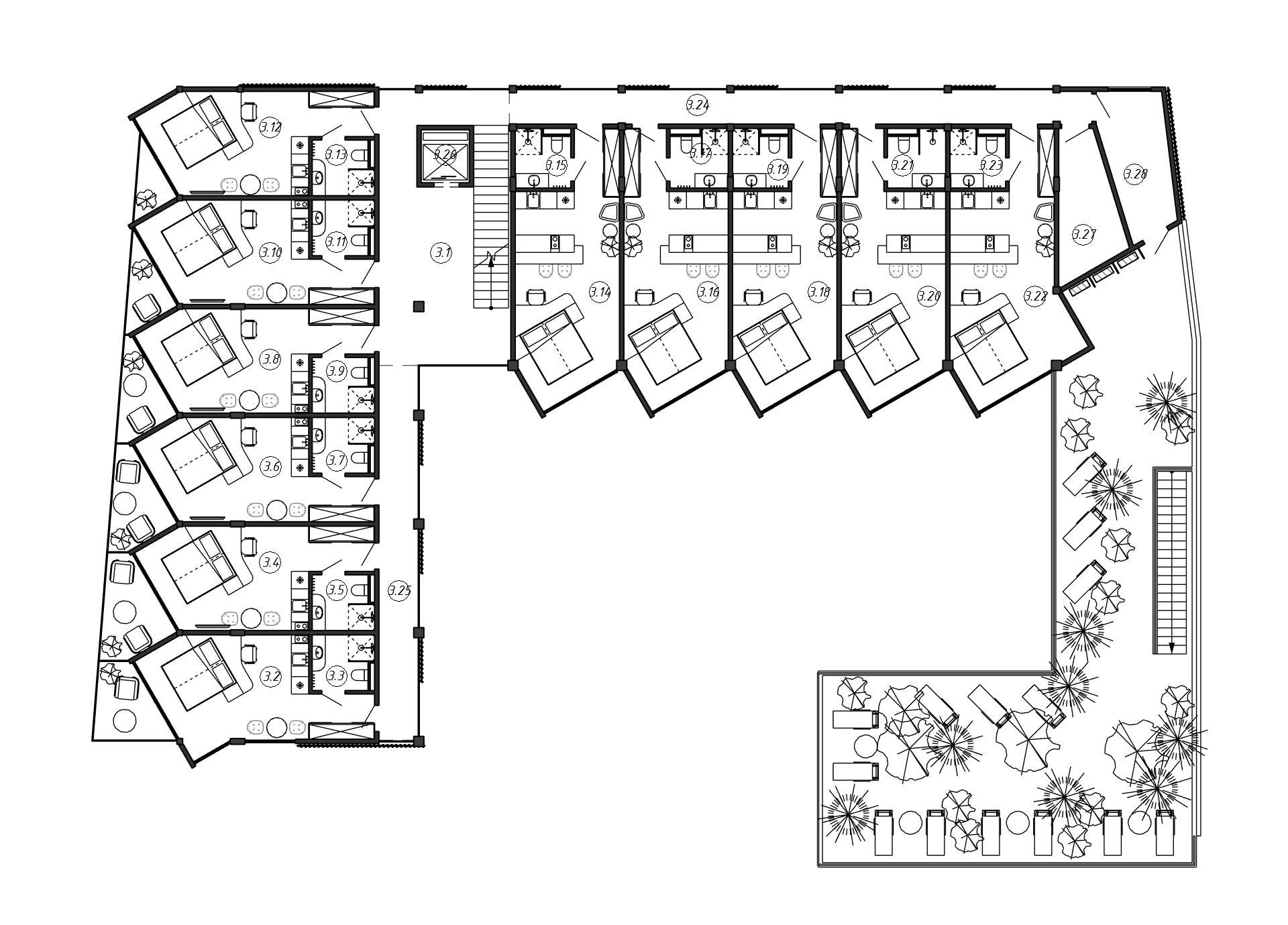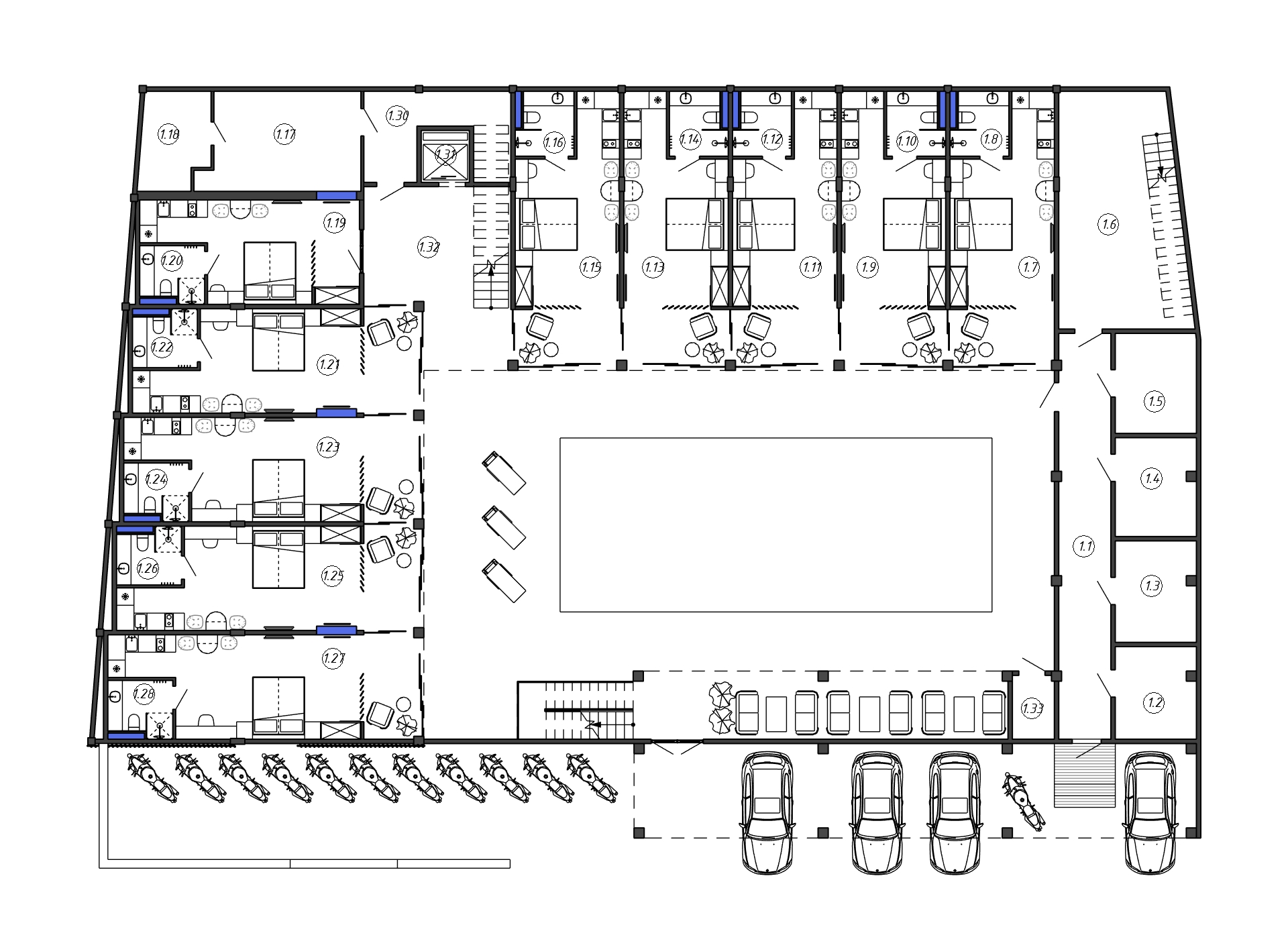 Проект реконструкции отеля на острове Бали включал в себя несколько этапов: создание концепции, разработка типологии номеров и общественных пространств, формирование внешней композиции и проработка деталей экстерьера. В результате было достроено два этажа, увеличено количество номеров до 42, в комплексе размещены ресторан, кафе, бассейн, коворкинг, комната для подкастов, две зеленые кровли с зонами отдыха, и площадка BBQ. В отделке фасадов преобладает декоративная штукатурка в сочетании с латунными панелями и рейками, а так же активно применяется вертикальное озеленение.