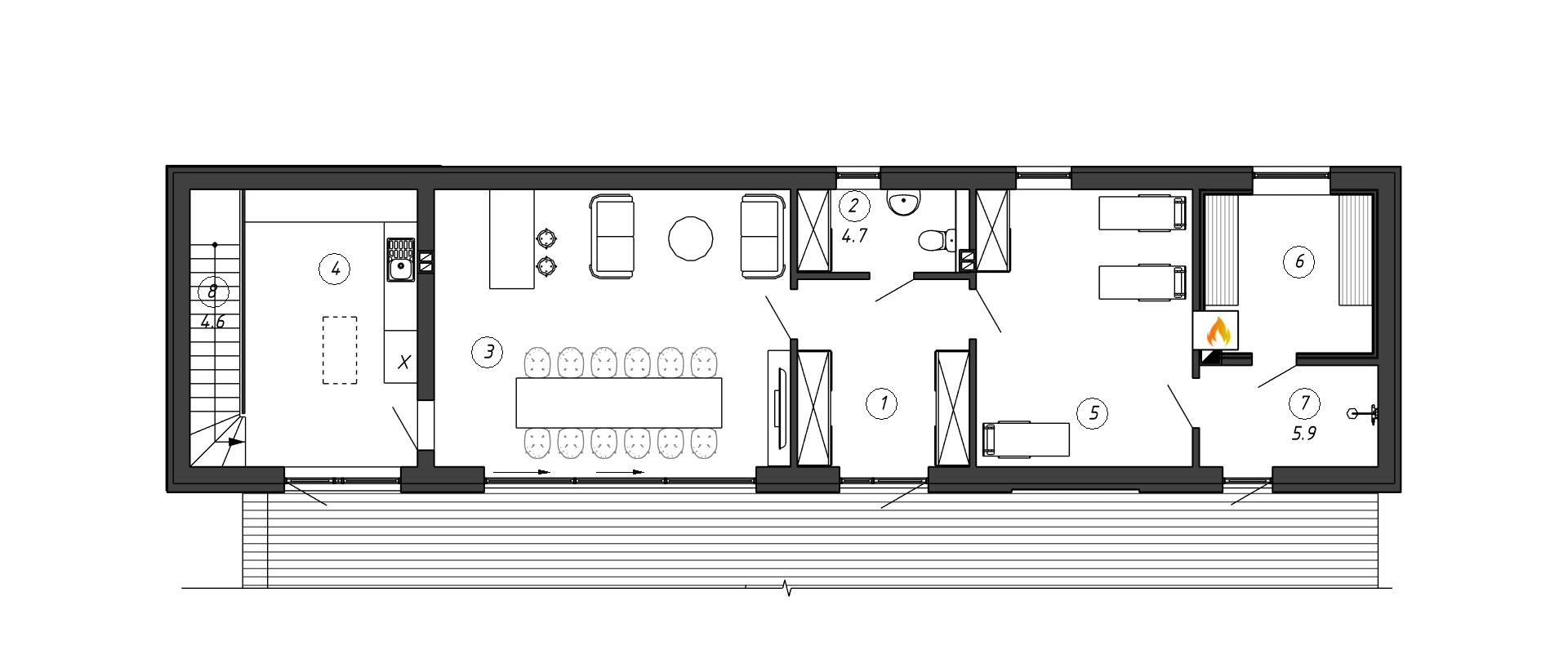 В этом проекте загородного комплекса на участке рядом с жилым домом размещен спа комплекс. В его состав входит кухня, гостиная с панорамным остеклением, релакс зона и комплекс помещений парной. В наружной отделке используется сочетание клинкерной плитки, клинкерного кирпича и штукатурки, за счёт чего формируется пластика на фасадах.