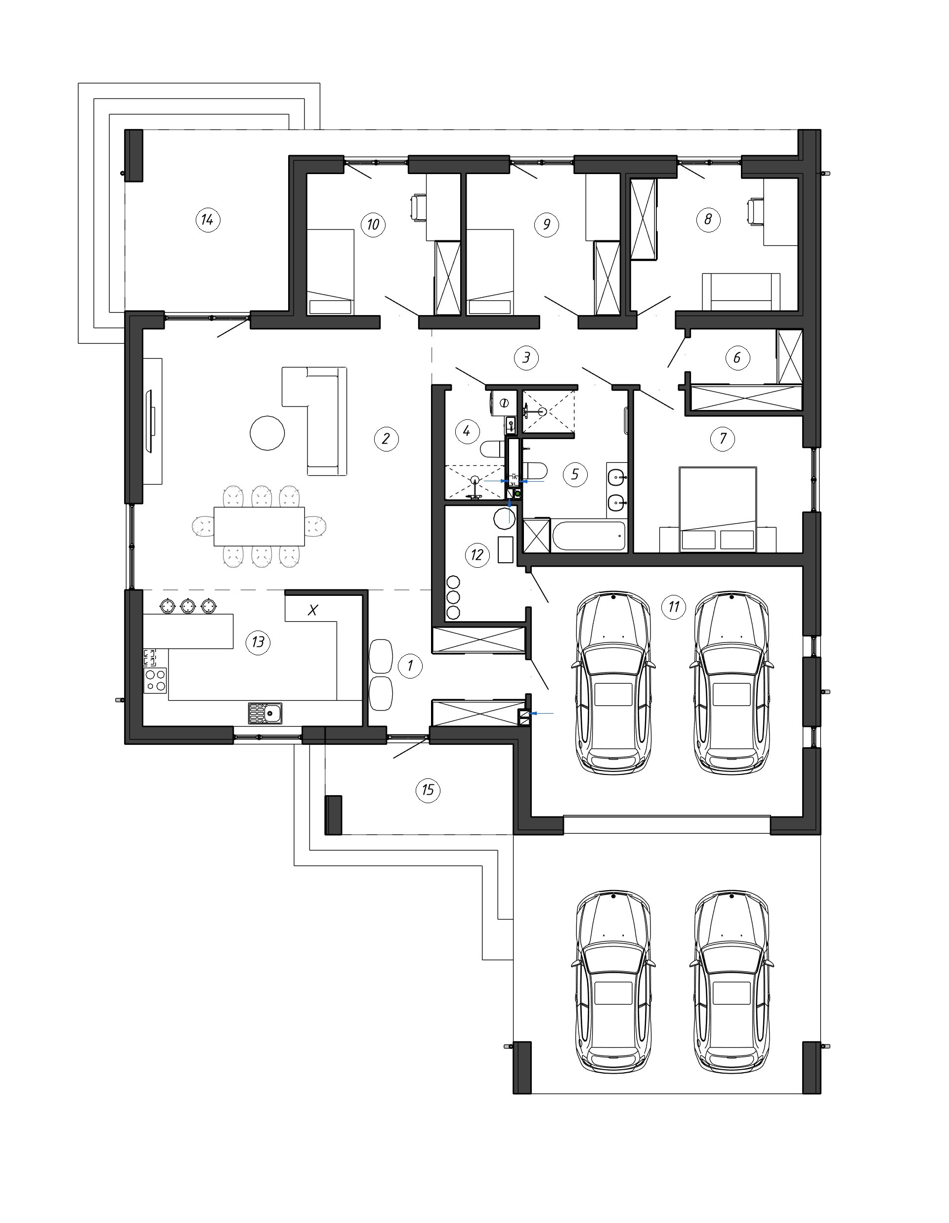 Минимальное количество коридоров позволило сэкономить полезную площадь и разместить просторную кухню-гостиную, а в жилой зоне три спальни и кабинет.