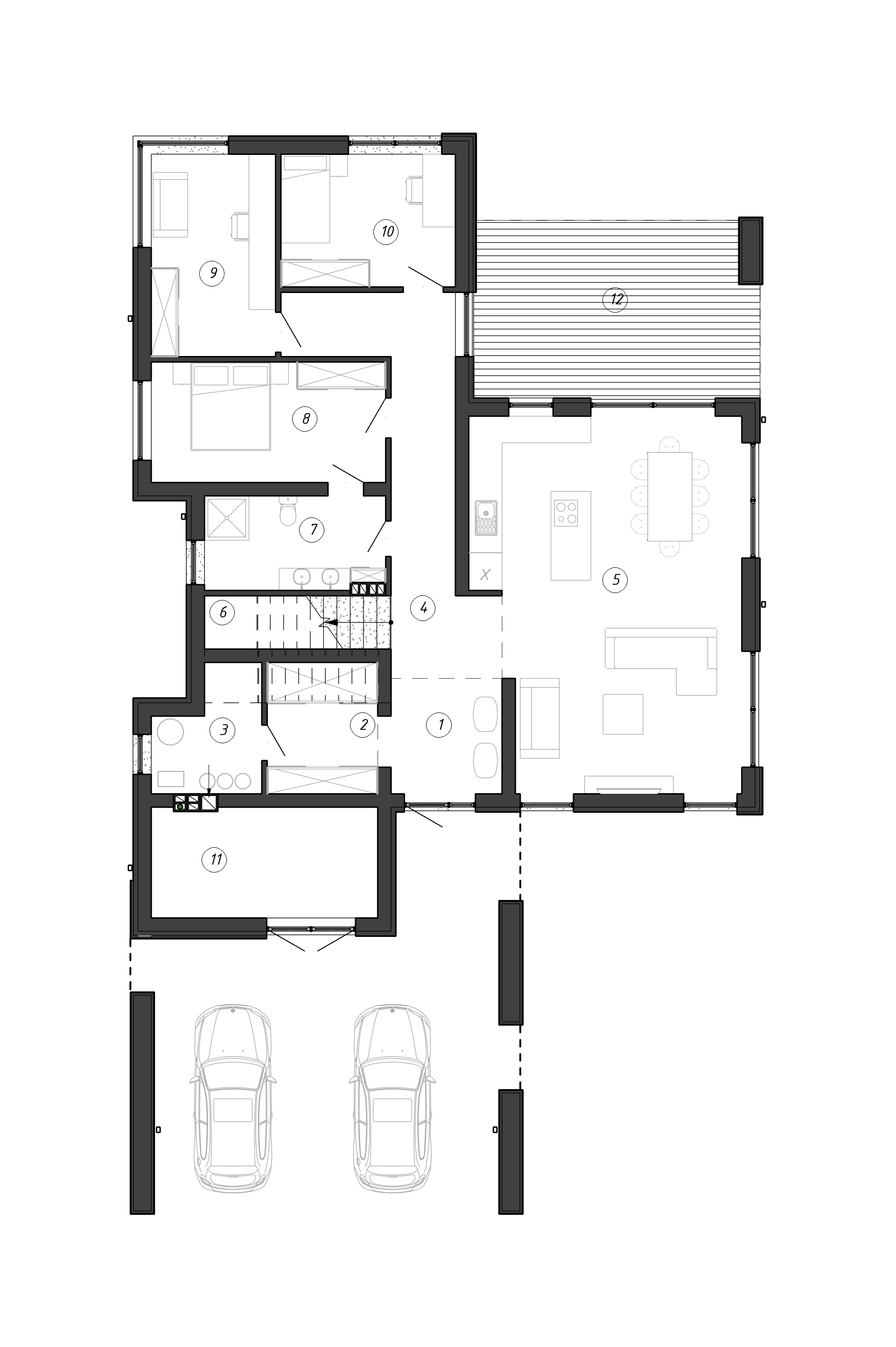 Особое внимание уделено компоновке пространства: на первом этаже расположены большая кухня-гостиная с окнами в пол и выходом на террасу, а также жилой блок с двумя спальнями и кабинетом.