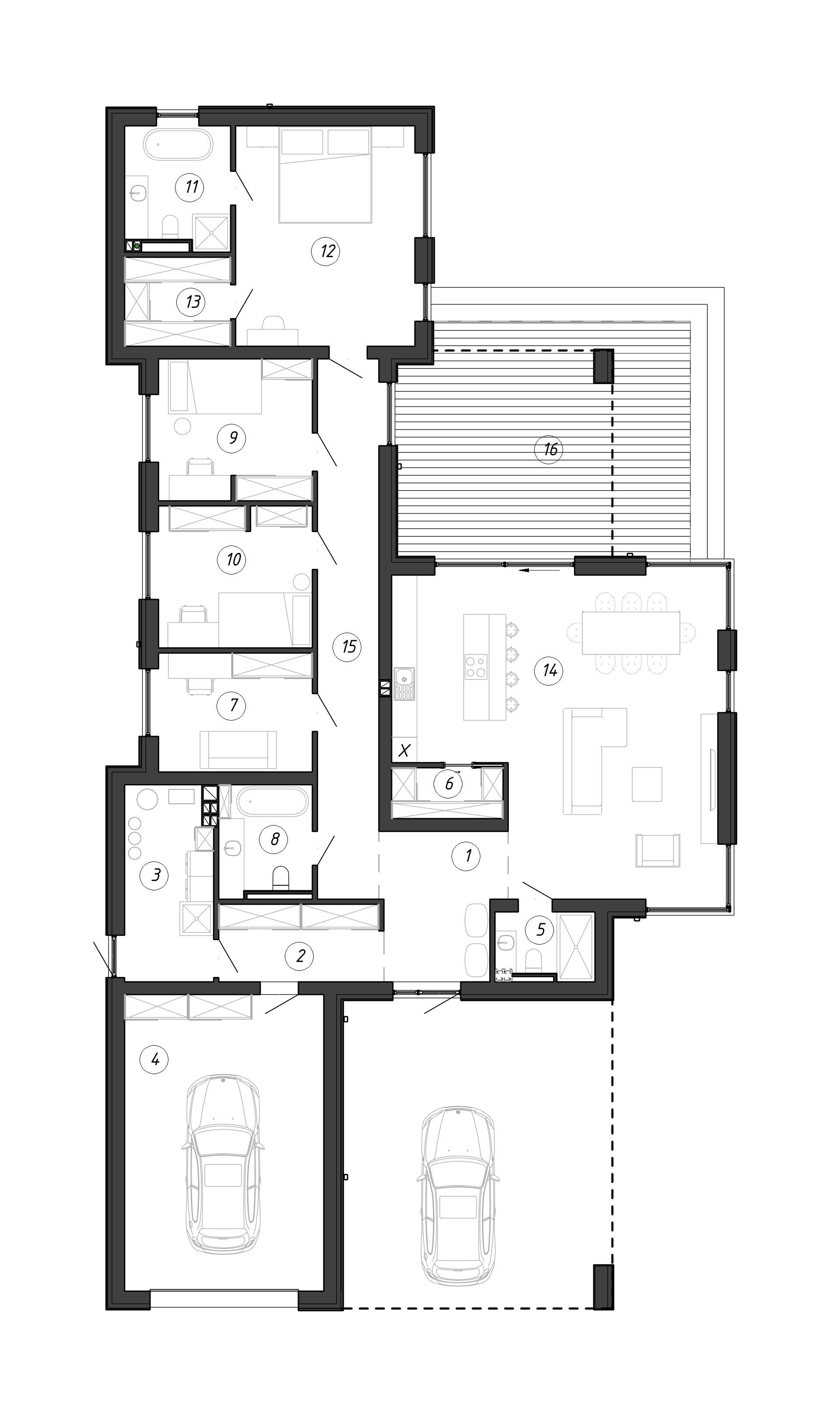 Одноэтажный дом с отделкой из белой клинкерной плитки в окружении зелени смотрится максимально эффектно! В композиции фасадов выделяется высокая центральная часть кухни-гостиной, а по бокам от нее разместились навес для автомобиля и крытая терраса. Рядом с прихожей расположена просторная кухня-гостиная с окнами в пол и выходом на террасу. В отдельную жилую зону сгруппированы две детских спальни, кабинет и мастер спальня со своим санузлом и гардеробной.