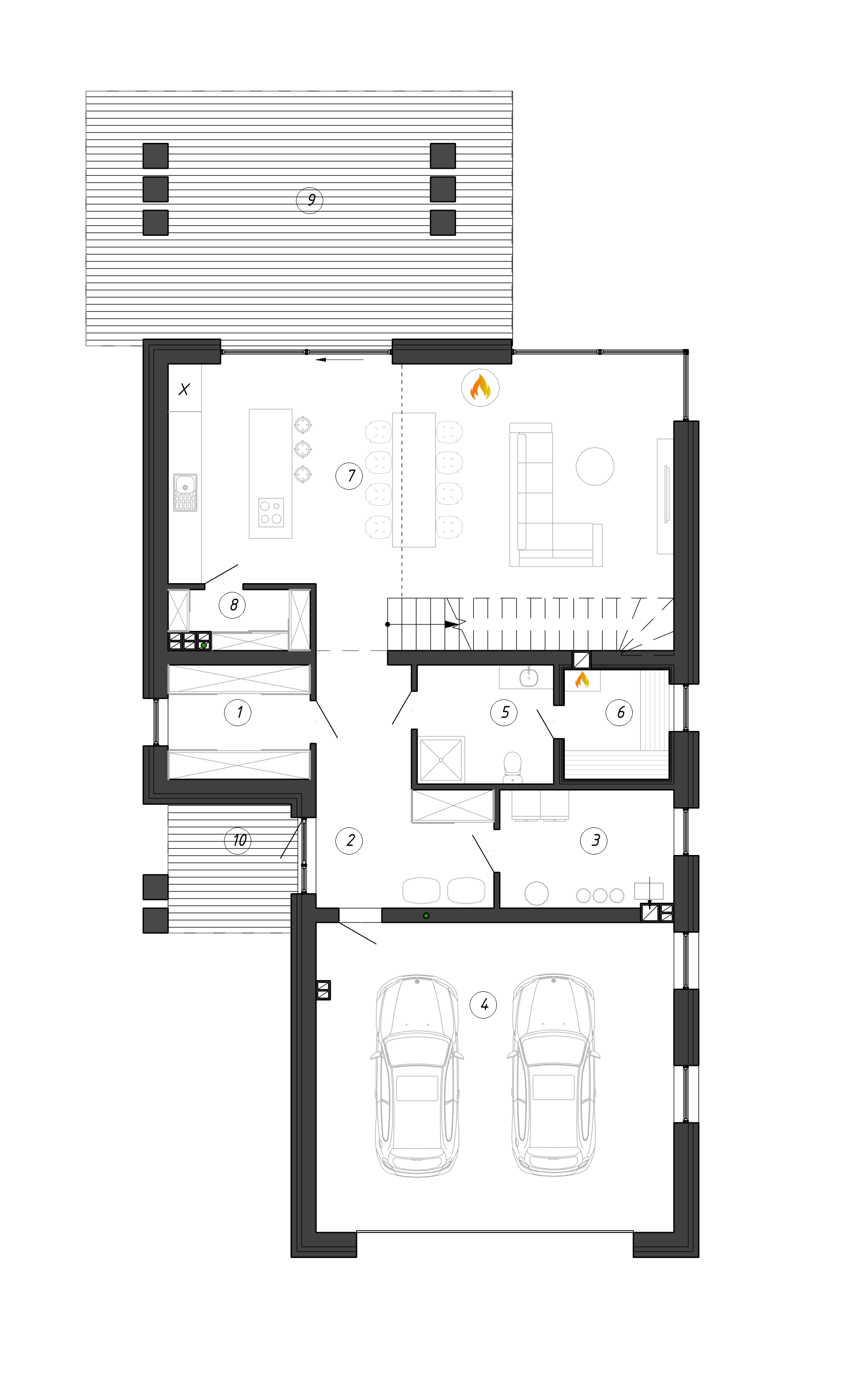 Кухня-гостиная высотой в два этажа выполнена со вторым светом, открытой лестницей и выходом на крытую террасу.
