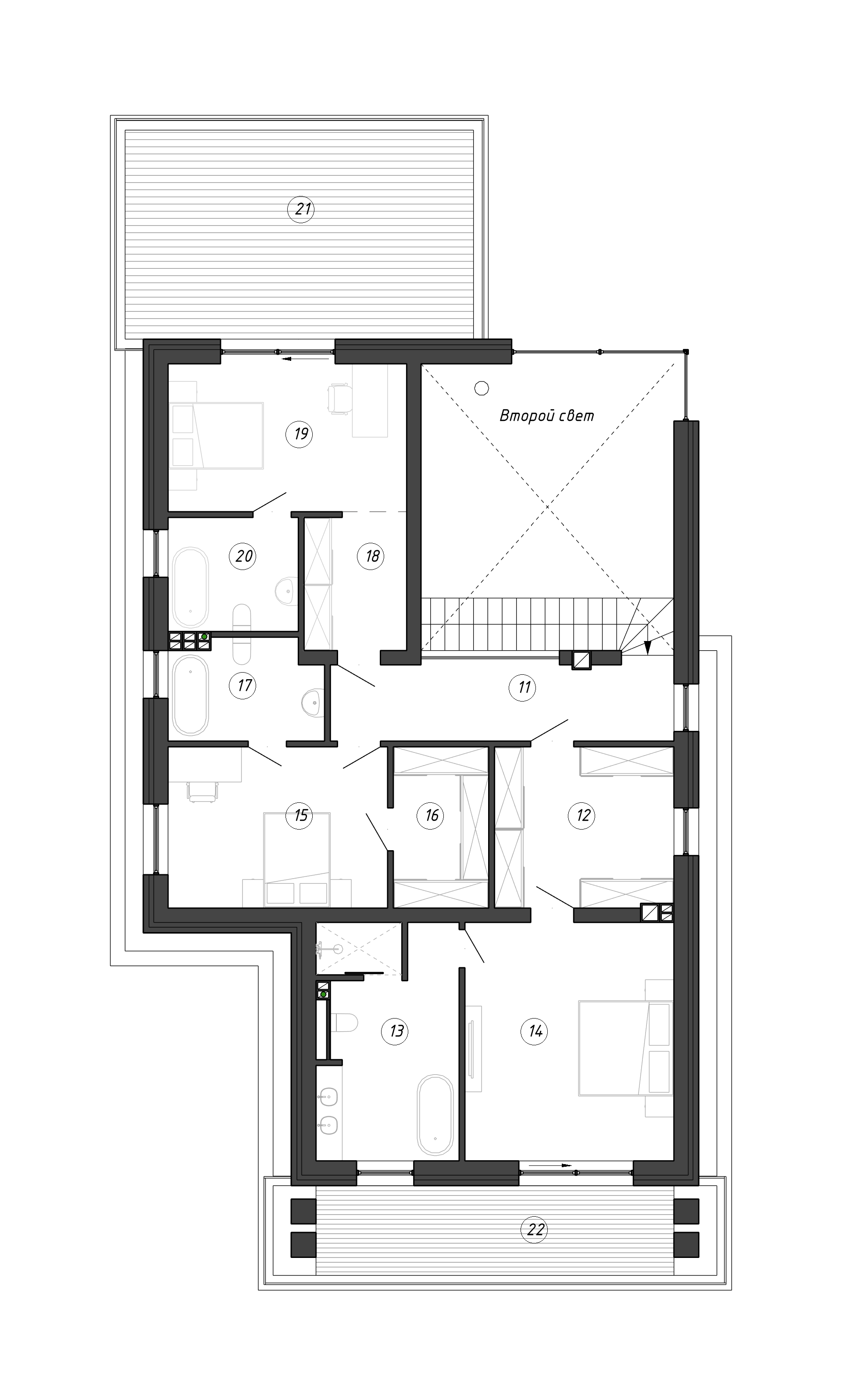 На втором этаже размещены три спальни каждая со своими гардеробными и санузлами.