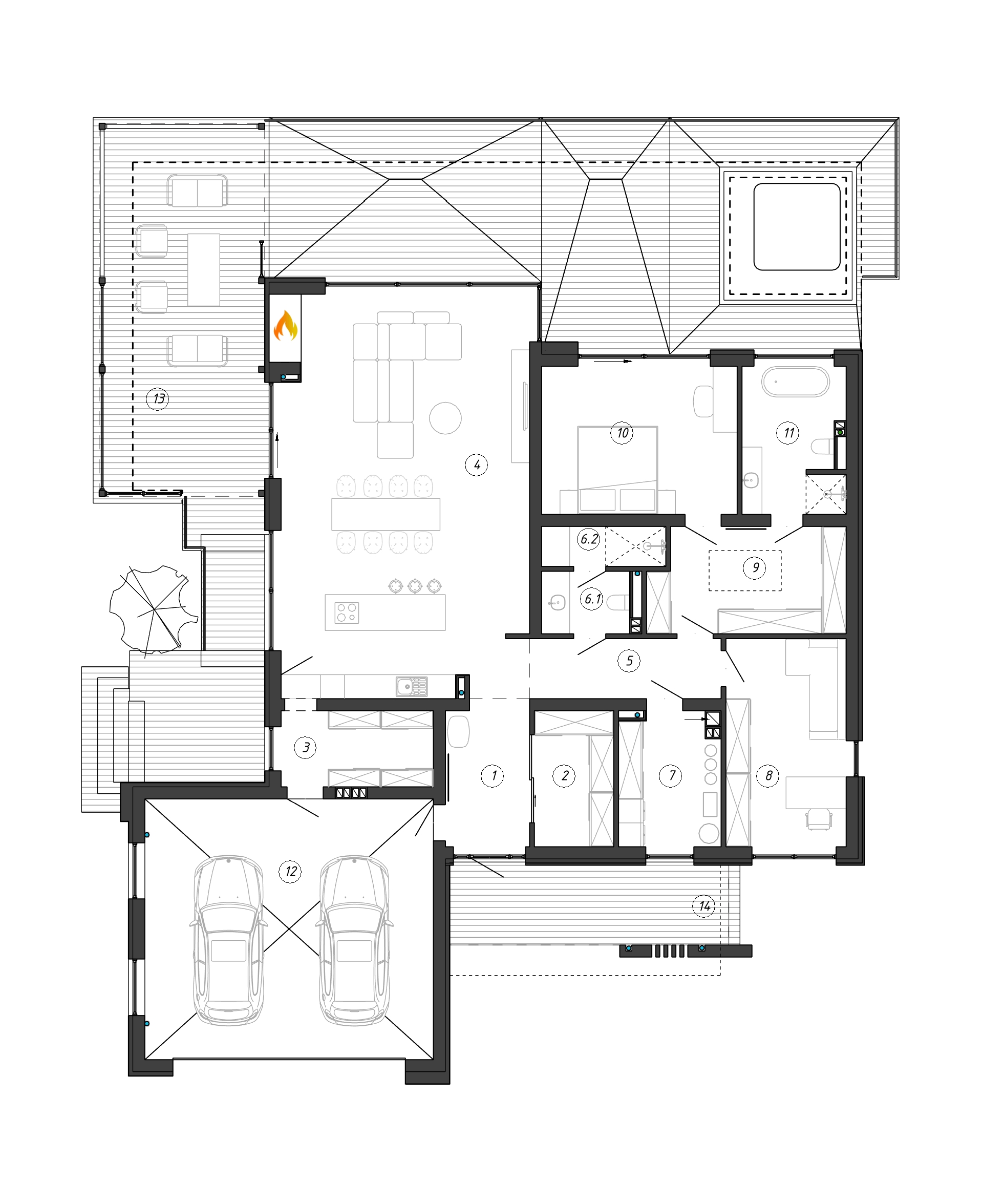 Размещение дома на склоне располагает к созданию подвального этажа с техническими помещениями. Благодаря разноуровневым перекрытиям на фасадах сформировалась композиция с выраженной доминантой, при этом высота потолков в кухне-гостиной получилась 3.9 метра, а в остальных помещениях 3 метра.