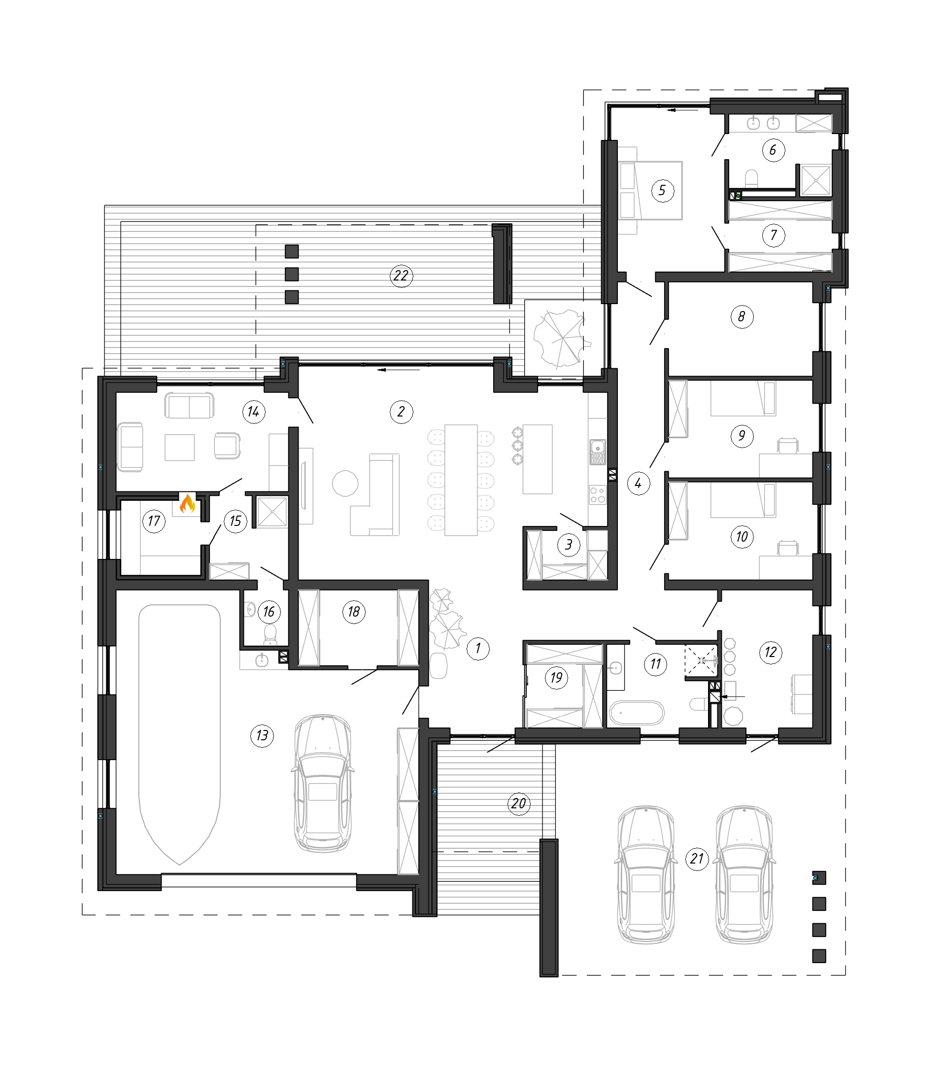 Просторный дом с интегрированным SPA-комплексом сочетает в себе строгость минимализма, скандинавскую функциональность и комфорт.